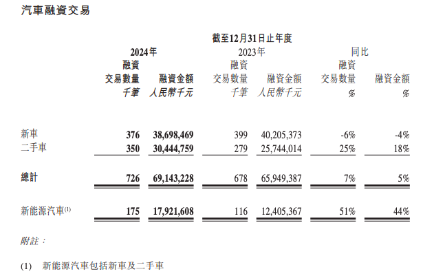 在新能源乘用车领域,2024 年新能源汽车融资交易量(包括新车及二手车)总计 17.5 万辆,同比增长 51%。